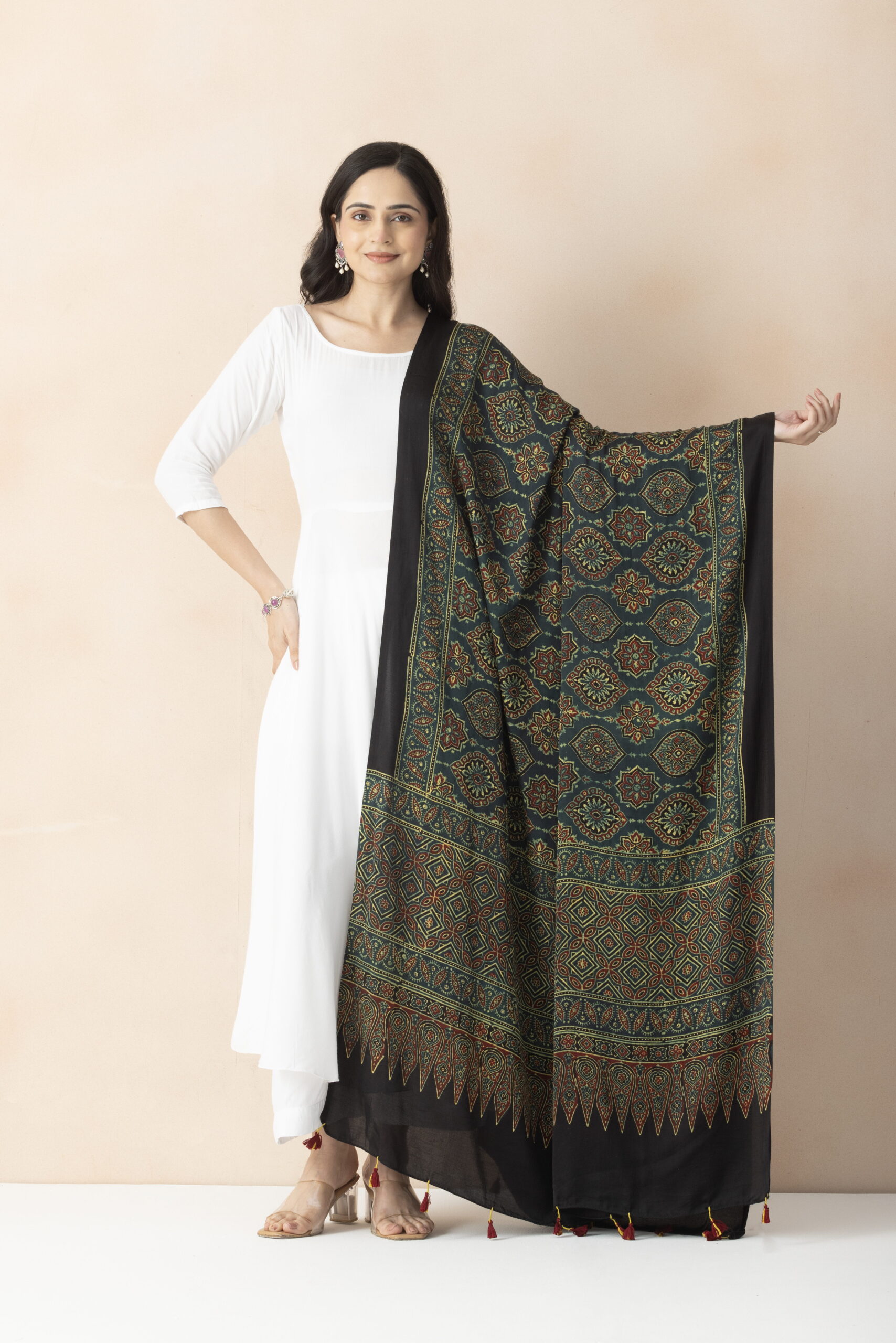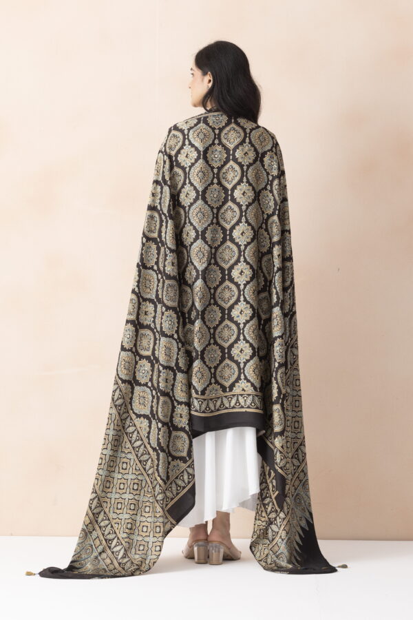 Redefine your traditional outlook with the range of colorful and high-quality dupattas from A R SILK DUPATTA HUB.This piece intricate designs and soft fabric.This ajrakh dupatta adds charm and sophistication.