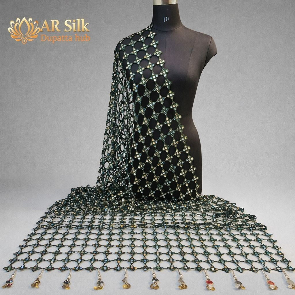 A R SILK DUPATTA HUB Women’s Original Mirror Work With Hand Made Tassels Light Green Fancy and Bridal Dupatta(ARS01275)