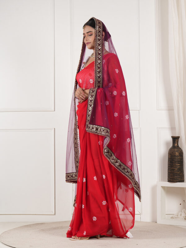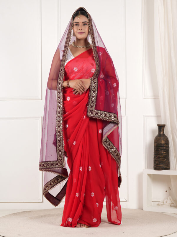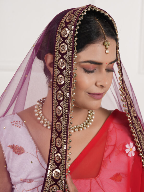A R SILK DUPATTA HUB Women’s Stone Work Net Dupatta With Zari Embroidered Work With 4 Sides Moti Lace Wine Fancy and Bridal Dupatta(ARS01202)